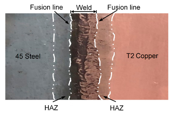 We preferentially adjust the parameters with reference to Table 1. After actual testing, the electron beam welding parameters of T2 Copper/45 steel dissimilar welding materials were as follows: acceleration voltage 80 kV, electron beam 100 mA, vacuum degree 5 × 10−2 torr, and welding speed 300 mm/min. The surface of the welding sample and the HAZ had a visible dividing line with the weld, which is clearly shown in Figure 1. Table 2 shows the chemical composition of T2 copper and 45 steel.