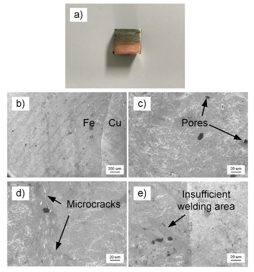 A 4 × 8 × 10 mm square sample was taken from the welded sample by Electrical Discharge Machining (EDM), as shown in Figure 2a, and Figure 2b–e show the microscopic topography of welded area via scanning electron microscopy (SEM) after polishing. The magnifications were 50 and 500 times, respectively. Figure 2b displays the iron and copper ends of the weld area. In Figure 2c–e, some pores, microcracks, and the insufficient welding area can be seen. These defects are the important factors that affect the welded bond quality of T2 copper-45 steel.