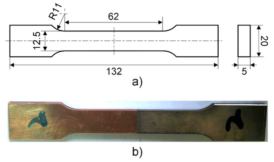 The tensile specimen was obtained by wire cutting according to GB/T228.1-2010 [46] (Metallic Materials-Tensile Testing-Part 1: Method of testing at room temperature). The ultimate strength, yield strength, and elastic modulus were determined while using the INSRON-8801 Servohydraulic Fatigue Testing System (Instron, Darmstadt, Germany) with a loading rate of 1 mm/min. Figure 3 shows the tensile specimen.