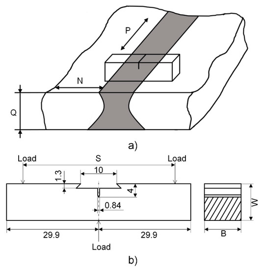 In the preceding Equations (1) and (2), the dimensional coefficient ξ is 1.6 × 10−4 m1/2, B is the sample thickness that is shown in Figure 4b, W is the width of the specimen, BN is the net thickness of the specimen and B, BN, W are 13 mm; the span S is 52 mm, the initial crack length a0 is 6 mm, the stress intensity factor coefficient g(a0/W) is 2.29; E is the elastic modulus; and, Rp0.2 is the specified plastic elongation strength of the material in the vertical crack plane 0.2% at the test temperature.