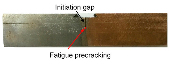 The fatigue crack was prepared while using the constant load method. After this process, the fatigue precracking of the three specimens was: 2.02, 1.96, and 2.04 mm. Figure 5 shows the final specimen of three-point bending.