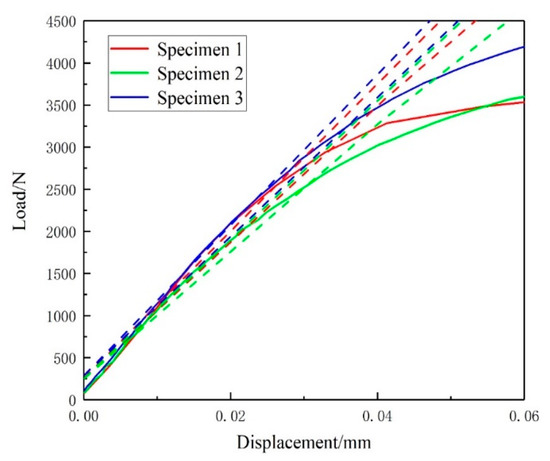 After the P-V curve of the three-point bending specimen was shifted, the value FQ of the three specimens was 3286.569, 2727.193, and 3581.864 N.