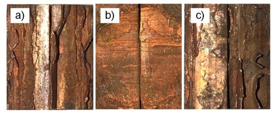 Macro-morphology fracture surface of three-point bending specimen (a) for specimen 1; (b) for specimen 2; and (c) for specimen 3; steel on the left and copper on the right.