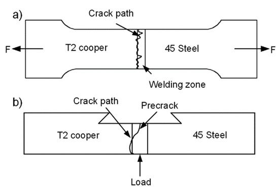The crack propagation path deflection of the dissimilar metal welding materials always deflects to the low strength material region [19]. The attached copper on the fracture area was caused by the deflection tear of the fracture path based on the aforementioned tensile test fracture morphology. Figure 13a shows a schematic diagram of the crack deflection of the standard tensile specimen, which was similar to the three-point bending test of T2 copper/45 steel dissimilar welding materials deflection path. This resulted in the phenomenon of stepwise reduction of the resistance to fracture due to the difference in the toughness between the weld area, HAZ and base metal in the electron beam welding process. Based on the three-point bending test of T2 copper/45 steel dissimilar welding materials cracking failure, the crack path was deflected due to the difference in the toughness, subject to factors, such as pores, micro-cracks in the weld area, crack deflection to T2 copper, as shown in the schematic diagram in Figure 13b.