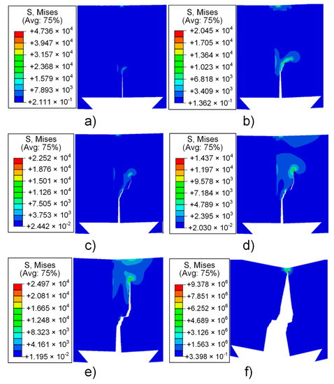 Three-point bending crack propagation simulation (a) step 1; (b) step 2; (c) step 3; (d) step 4; (e) step 5; (f) step 6.