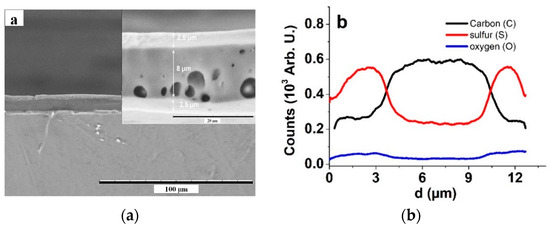 SEM images of a cross section of PP–IPN trilayer (scale bar 100 µm), including an inset for the thickness estimation of different layers. (b) EDX spectroscopy line scan of elemental composition of the cross section (inset of a) showing carbon (C, black), sulfur (S, red), and oxygen (O, blue) relative content.