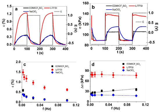 The strain–frequency dependencies (Figure 3c) in all of the three electrolytes follow a very similar pattern: the highest values are reached at the lowest frequency, as expected. The difference in stress Δσ (stress at oxidation and reduction, Figure 3d), on the other hand, shows rather unusual behavior. Firstly, the stress of PP–IPN trilayers was only very slightly dependent on the applied frequency in LiTFSI and NaClO4. Secondly, the stress in EDMICF3SO3 actually increased slightly with increasing frequency. A slight fallback in strain in the case of a relatively low frequency actuation of PEDOT has been observed before [34]; this was assigned to a lower electro–chemo–mechanical coupling (compared to polypyrrole), allowing more solvent to accompany the ions upon ingress. Since the packing of a conducting polymer depends on the initial doping anion, the polymeric PSS, in our case, is expected to lead to an even more open structure, allowing more space in which the ions may move around. The latter is especially significant for the poorly-solvated EDMI+ cations, while Li+ naturally brings in the most solvent, leading to partial relaxation.