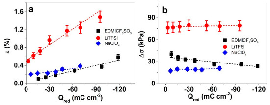 As could be expected from the current densities, the highest charge densities of the trilayers were those in EDMICF3SO3 at 0.0025 Hz with −118.5 ± 8.3 mC cm−2. Figure 4a shows that the strains increased with increasing charge density (on reduction) for all the applied electrolytes, thereby following the laws of faradaic processes [35], i.e., where charge density determines actuation response. The stress difference plots (Figure 4b) are, again, more interesting, with only a slight increase of stress difference with increasing charge density for PP–IPN trilayers operated in LiTFSI and NaClO4. In the case of the EDMICF3SO3 electrolyte, there was, in contrast, a small decrease of stress difference with increasing charge density. This discrepancy is likely related to the variation in the balance of the Faradaic and (apparent) EDL mechanisms of activity. As the conductivity of the trilayers in the three electrolyte solutions is remarkably different, so is the actual voltage driving the processes in the “bulk” of the electrodes; therefore, the higher-conductivity of EDMICF3SO3 makes it possible to reach voltages of more Faradaic-nature processes, while the lower conductivity electrolytes limit the processes to the EDL region.