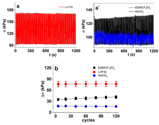 Stress response stability during square wave potential steps (0.1 Hz) for PP–IPN layers in EDMICF3SO3 (black, ■), LiTFSI (red, ●) and NaClO4 (blue, ♦) in (a,a`): stress (blocking force) vs. time; (b) stress difference vs. cycle number.