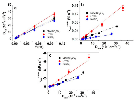 (a) diffusion coefficients vs. frequency upon reduction in PP–IPN trilayers in EDMICF3SO3 (■, black), LiTFSI (●, red) and NaClO4 (♦, blue) solutions. The strain rate νredstrain in (b) and the stress rate νredstress in (c) against the diffusion coefficients upon reduction. The dashed lines symbolize the linear fits and are shown as visual guides.