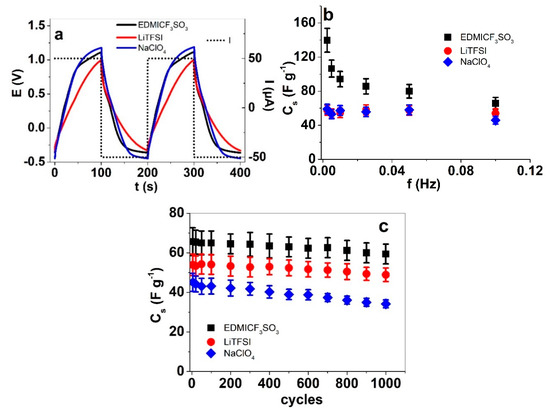 If the potential time curves (Figure 7a) are concurrent in the successive cycles, the system is in balance, which means that charging/discharging is in the so called “steady state” [35]. Figure 7b shows the specific capacitance against the applied frequency for PP–IPN trilayers in the three electrolyte solutions. The trilayer operated in EDMICF3SO3 showed the highest specific capacitance, i.e., 140 F g−1 at 0.0025 Hz. Values of 103 F g−1 have been shown before for PEDOT electrodes in Et4NBF4/acetonitrile [9]. Until now, only composites using nanostructured additives such as CNT have reached specific capacitances in the range of 148 F g−1 [36]. Apparently, by using ink-jet printing and an appropriate electrolyte, pure PEDOT:PSS is capable of similar capacitances. As is common for electroactive polymers, the specific capacitance in EDMICF3SO3 decreased with increasing frequency to 65.6 F g−1 at 0.1 Hz. However, the trilayers operated in LiTFSI and NaClO4 revealed rather odd behavior, as the specific capacitance value remained in the range of 54–56 F g−1, virtually independent of the applied frequency and current. This discrepancy can again be explained by the apparent dominant charging mechanisms, which in LiTFSI and NaClO4, have more of a capacitive nature following the EDL charging mechanism, while in EDMICF3SO3, the trilayers behave more like typical conducting polymers, following the redox (Faradaic) mechanism. However, the cycle to cycle stability of the specific capacitance does not depend significantly on the apparent mechanism, as seen in Figure 7c for 0.1 Hz. After 1000 cycles, the specific capacitance of all the PP–IPN trilayers was reduced, almost by a quarter in the worst case, i.e., for NaClO4. In the case of EDMICF3SO3, the specific capacitance of 65 F g−1 at cycle 5 decreased to 59.4 F g−1 by cycle 1000 (decrease of 8%). For energy storage applications like supercapacitors, PP–IPN trilayers in a PC solution of EDMICF3SO3 would be most suitable, as they offer the best capacitance and the highest stability, at least after 1000 cycles.