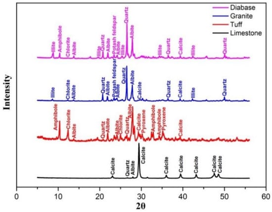 The XRD pattern of four aggregates was shown in Figure 2. It can be seen that the compositions of four aggregates were significantly different. The main component of the limestone was calcite, which accounted for the vast majority. The tuff in this study was mainly composed of albite, amphibole and chlorite. The granite was mainly composed of quartz and albite. The main component of diabase is quartz, albite and amphibole (some has been metamorphic to illite). Since the mineral composition of aggregates have a great influence on its properties, the morphology of different aggregates may change differently after abrasion test.