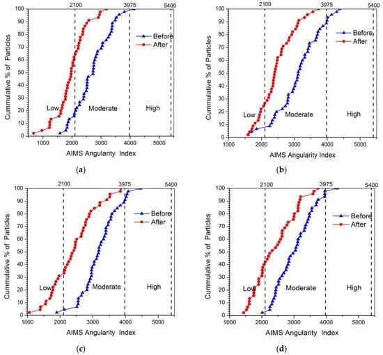 Percentage cumulative distribution of angularity before and after abrasion (a) Limestone; (b) Tuff; (c) Granite; (d) Diabase.
