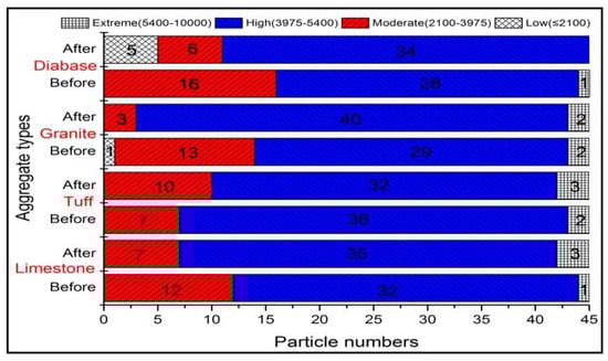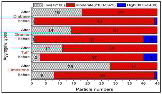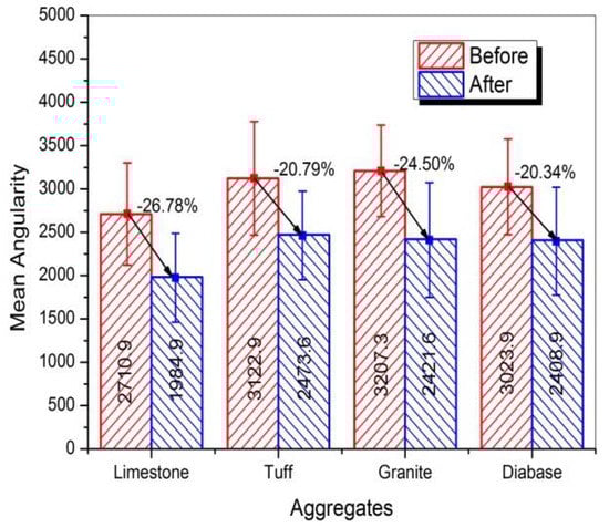 Figure 5 showed the plot of angularity for four kinds of coarse aggregates (i.e., limestone, tuff, granite, and diabase) before and after abrasion test. Obviously, the angularity value for each type of aggregate significantly reduced after abrasion, which was consistent with the results of Mahmoud’s research [23]. During the abrasion process, the angular areas of aggregates will rub against the steel ball first, causing the aggregate becoming less angular after abrasion. However, there was an obvious difference among the angularity distributions for various types of coarse aggregates, which might be caused by the differences in mineral compositions. The mean angularity of different aggregates was shown in Figure 6, and variation in angularity distribution of coarse aggregates can be further understood by comparing the number of particles in each angularity range (low, moderate and high), as plotted in Figure 7.