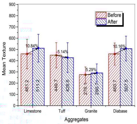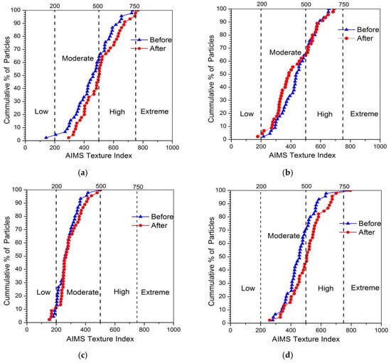 The plot of texture for four kinds of coarse aggregates before and after abrasion test was shown in Figure 8. Unlike the angularity, the surface texture of coarse aggregates did not reduce after abrasion, and even increased slightly for some types of aggregates. This result indicated that the abrasion test cannot be able to affect the microscopic surface texture of coarse aggregates. The slight increase of texture might be caused by the new breakage surface appeared in a small amount of aggregates during the abrasion process. The mean texture of different aggregates was shown in Figure 9, and variation in texture distribution of coarse aggregates was plotted in Figure 10.