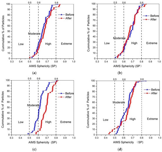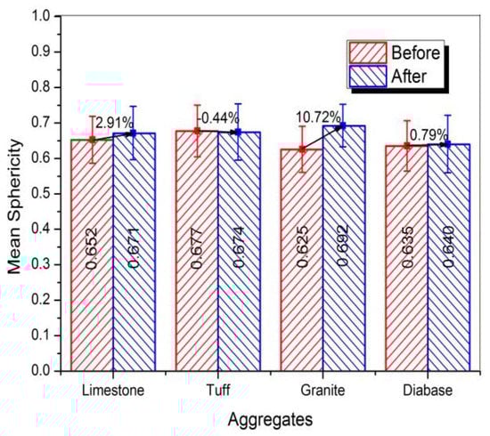 Figure 12 showed except for granite aggregates, there was no significant difference for the mean value of sphericity before and after abrasion test. The mean sphericity of granite aggregates was increased by 10.72%, higher than that of other type aggregates, indicating there were more flat or elongated particles in the granite aggregates. The sphericity distribution in Figure 13 showed that some aggregates in low and moderate sphericity ranges transferred to high sphericity range after abrasion, whereas very few aggregates in high or moderate sphericity range transferred to low sphericity range. The reason was that the flat or elongated particles are easier to break comparing with the round particles.
