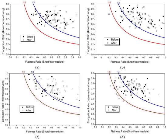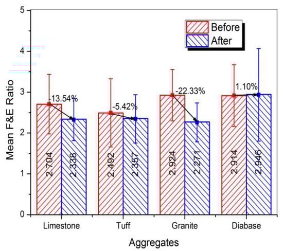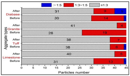 Obviously, Figure 15 showed that the granite aggregates before abrasion had the highest F and E ratio, which can be used to confirm the greater improved sphericity of the granite aggregates after abrasion. The largest reduction of F and E ratio indicated that the flat or elongated particles were easy to break and should be controlled. Compared to other two types of aggregates, limestone aggregates had the larger reduction of F and E ratio, which might be caused by its high content of calcite. Figure 16 showed that most coarse aggregates with an aspect ratio of 1:3 to 1:5 transferred to the range of an aspect ratio of 1:3, which was reflected in the different distribution in Figure 14.