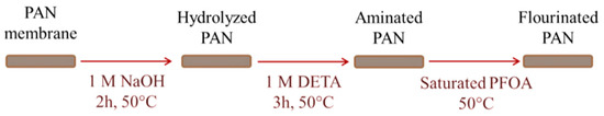 Fluorinated polyacrylonitrile (PAN) membrane is prepared by grafting a low surface free energy molecule pentadecafluorooctanoic acid onto aminated PAN membrane surface through the acylation reaction between the carbonyl groups of pentadecafluorooctanoic acid (PFOA) and amine groups on aminated PAN membranes as shown in Figure 1. Grafting of perfluoroalkyl groups onto the aminated PAN membrane surfaces manipulated the physicochemical features; and as a result, an excellent antifouling property was obtained. The membrane surface energy significantly lowered by the presence of non-polar hydrophobic perfluoroalkyl groups on the membrane surfaces [63].