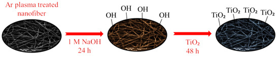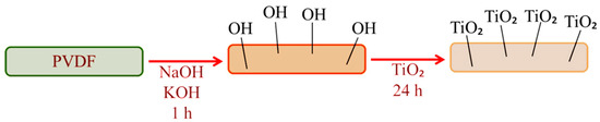 A similar attempt has been made using PVDF nanofiber web. Differently, the plasma treatment has been eliminated [64]. PVDF membranes were defluorinated in alkaline solution, and then TiO2 nanoparticles were attached on the surface, as illustrated in Figure 3. Results indicated that after adding TiO2 nanoparticles, membranes exhibited outstanding antifouling and self-cleaning performance with high selectivity.