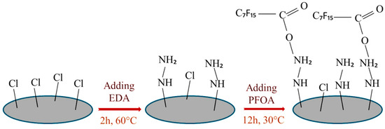 Novel fluorinated membranes were fabricated by polyvinyl chloride (PVC), and chlorinated polyvinyl chloride (CPVC) blend membranes. First, ethylenediamine (EDA) was used for the amination of PVC/CPVC blend membranes by chemical grafting method. Second, by using the chemical reaction between the redundant amino group of EDA and the carboxyl group of pentadecafluorooctanoica acid (PFOA), fluorination treatment was achieved (illustrated in Figure 4). The fluorinated membranes exhibited high permeate fluxes (over 40 L/(m2h)), low flux decline, and high flux recovery in oil/water emulsion [65].