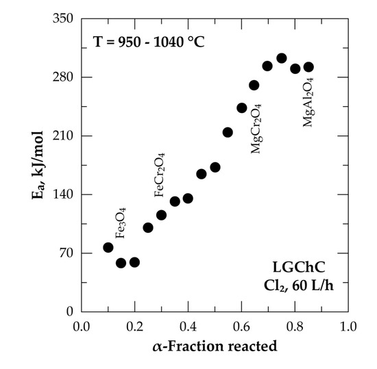 - the rest of the chromite reaction with Cl2+O2 (α > 0.50) is affected by the reaction of MgO (MgCr2O4) which is characterized by a low reaction rate and a high Ea value.