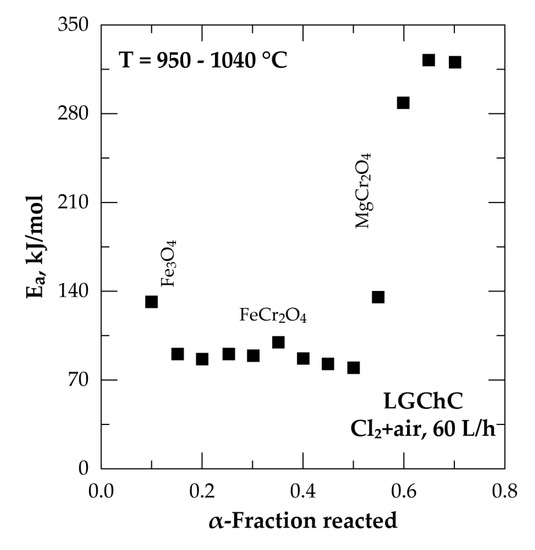 - the reaction of chromite with Cl2+O2, for 0.15 ≤ α ≤ 0.50, is controlled by the reaction rate of Cr2O3 (contained in FeCr2O4) being the slowest step of the overall reaction rate. The lower value of Ea seems another argument for Cr2O3 impact on the overall reaction of chromite,
