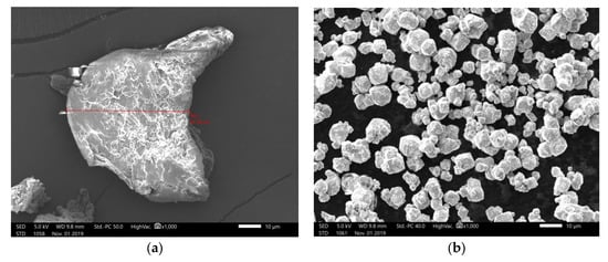 Tungsten powders of different weights (G50 = 1 μm, density 19.35 g/cm3, Qinghe County Xindun Metal Material Co., Ltd., Hebei, China) and PEEK (G50 = 50 μm, density 1.30 g/cm3, VICTREX®, 450PF, Lancashire, UK) were used for the preparation of PEEK/tungsten composite materials, in which PEEK was employed as substrate and tungsten as a reinforcing agent. Composite materials with different tungsten contents (50 wt. %, 60 wt. %, and 70 wt. %) were obtained after vacuum drying, materials mixing, air flow dispersion, screw granulation, and wire extrusion processes. The respective electron microstructures of PEEK and tungsten are shown in Figure 1a,b. A certain agglomeration was noticed in tungsten.