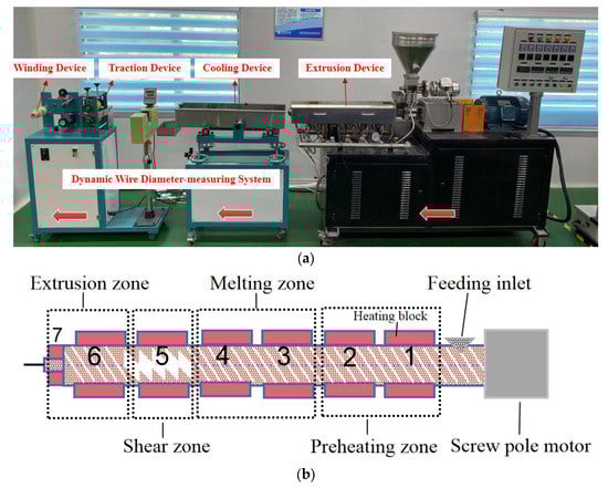 Preparation process of PEEK and PEEK composite fused deposition modeling (FDM) 3D printing shielding wire: (a) a picture of the screw extruder equipment, (b) the heating zones of the extrusion device.