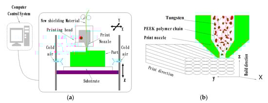 Polymer materials with high strength, superior toughness, and elevated temperature resistance are widely used in electronics, machinery, aerospace, and other industrial fields [32,33,34,35]. Thermoplastic/tungsten composite materials, such as nylon and polyamine, have close densities to that of lead but much stronger in terms of yield strength. Besides, these materials have no toxicity, and are usually produced by molding and injection molding methods [36,37]. However, errors always occur during the design processing since die-casting molds have complex shapes, curved surfaces, and narrow grooves [38,39]. The attenuation of low-energy gamma-rays by epoxy resin is mainly achieved by a photoelectric absorption effect but the irradiation accelerates the aging of epoxy resin. To limit this effect, poly-ether-ether-ketone (PEEK) as a semi-crystalline thermoplastic high-temperature polymer with an elevated melting point is widely adopted thanks to its excellent features in terms of mechanical properties and superior resistance against heat, good corrosion resistance, and relevant fatigue and wear resistance [40,41]. The PEEK irradiation aging also ensures excellent radiation resistance. However, the high melting point of PEEK may lead to elevated viscosity of viscoelastic fluid passing through the head during processing, thereby generating excess flow resistance. Nevertheless, elastic turbulence occurs at a certain extrusion speed limit, forming defects and generating distortion on the surface of the molten mass. Additionally, PEEK is largely constrained by high cost and processing difficulties [42].