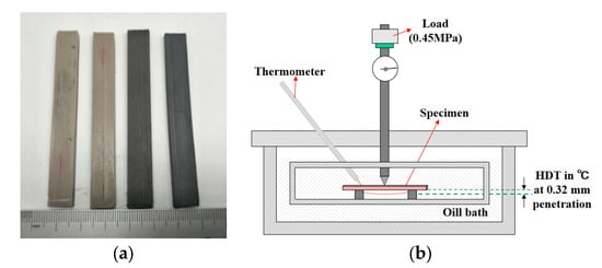 Plastics, hard rubber, and long fiber reinforced composites were used to conduct experiments according to “The Plastics-Determination of Temperature of Deflection under Load-Part 2: Plastics, Ebonite and Long-reinforced Composites” of national standard GB/T1634.2-2004 of the People’s Republic of China [55]. Equivalent to ISO 75-2:2003 (IDT), this standard specifies the detailed requirements for meeting for experiments, in which 0.45 MPa flexural stress method along with laid flat samples (size 80 mm × 10 mm × 4 mm, equivalent to flexural strength sample) were adopted for experimentation (Figure 8a). Qualified FDM 3D printed and processed test pieces were made according to GB/T 1634.2-2004 standard and tested by The Deformation and Vicat Softening Temperature Tester (Vicat/HDT-TESTER, COESFELD, Dortmund, Germany). Under 0.45 MPa load, the temperature rised from room temperature (23 °C) at the rate of 2 °C/min. When the deformation reached 0.32 mm, the corresponding oil bath temperature was the heat deflection temperature to be measured (Figure 8b).