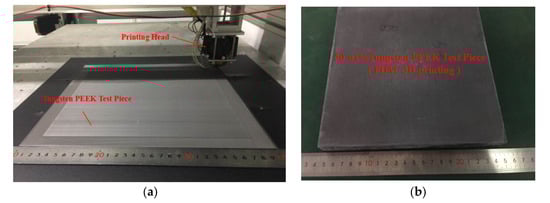 The thermoplastic characteristics of PEEK induced by its high melting point (343 °C) led to larger melt viscosities after melting. However, PEEK displayed enhanced shrinkage rate and semi-crystallization after cooling. Note that tungsten had a melting point of 3410 °C combined with a small expansion coefficient and elevated thermal conductivity above 100 °C. PEEK/tungsten composite materials prepared by traditional injection molding and molding methods were often characterized by low material utilization rate, high cost, many processing defects, and difficult processing. On the other hand, the FDM 3D printing temperature control system would play an important role in successful processing. During the printing process, the selection of appropriate printing speed (nozzle movement speed), nozzle temperature, and cooling efficiency at the nozzle would largely affect the molding quality. Thus, optimal combination was utlized to complete the processing, and the as-obtained FDM test pieces employed for mechanical properties testing are provided in Figure 7.