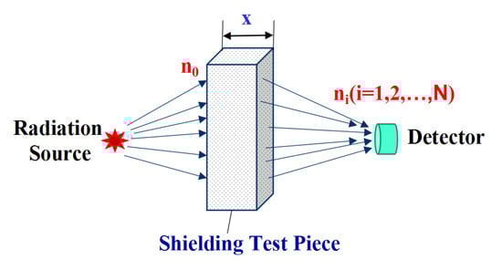 The exponential decay law of gamma-rays was discovered in 1909 by Soddy and Russell [57]. A schematic diagram of the experimental model used for gamma-ray attenuation was presented in Figure 11. After the passage of gamma-rays with n0 radiation through the shielding test body with thickness x, the attenuated radiation amount ni (i = 1, 2, …, N) could directly be described by Equation (1).