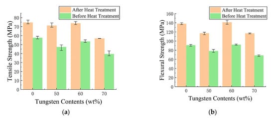 The tensile strength values of PEEK and PEEK composites containing different tungsten contents are provided in Figure 12a, where the green bar graphs presented the tensile strength before heat treatment used for analysis. The test speed was set at 1 mm/min. Using tungsten contents from 50 wt.% to 60 wt.%, the tensile strengths showed a slight increase. After the complete melting of PEEK to form colloids, small amounts of tungsten aggregated in the colloid with supporting roles. Under the action of wire thrust, the melted PEEK colloids became wrapped on the surface of tungsten, irregularly filling the shaped voids. After cooling and hardening of PEEK, tungsten became completely embedded and combined with PEEK to form a novel composite. At tungsten contents from 50 wt.% to 60 wt.%, the tensile strength increased by 11.59%. On the other hand, the agglomeration of tungsten became increasingly serious as tungsten powder content rose. The rapid cooling and molding of melted PEEK led to difficult infiltration of the molecular chains into the tungsten agglomerates within short periods. Therefore, the agglomerates maintained their original random accumulated gap states, and micro-pores easily formed in the cooled and molded composite materials. Tungsten contents in PEEK above 60 wt.% led to declining trends. For instance, the tensile strength of 70 wt.% PEEK/tungsten composite was 26.30% lower than that of 60 wt.% PEEK/tungsten. Additionally, the agglomeration of tungsten powders formed numerous micro-pores, highly affecting the tensile strength of the test pieces.