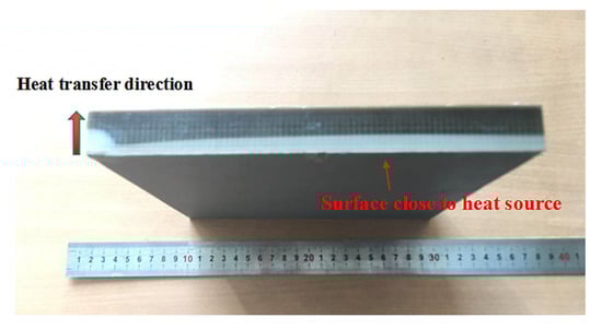 The pink bar graphs in Figure 12 refer to the tensile and flexural strengths after heat-treatment, which looked to be greatly improved. Note that heat-treatment was used to fix the FDM 3D printed test pieces to fit with the standards GB/T 1040.2-2006 and GB/T 9341-2008 through fixtures in two aluminum flat plates with smooth surfaces. To fully dry the PEEK and PEEK/tungsten composite materials, the test pieces and fixtures were subjected to 80 °C heat for 5 h and then quickly placed in a 300 °C thermostatic temperature control box for 2 h. Afterwards, they were taken out and the temperature was rapidly reduced to below 140 °C, representing the crystallization temperature of PEEK. The specimens were finally cooled down for 1 to 3 days at room temperature. According to the results, the tensile strengths of pure peek, 50 wt.%, 60 wt.% and 70 wt.% PEEK composites rose by 22.88%, 33.51%, 27.52% and 30.60%, respectively. Additionally, the flexural strengths enhanced by 34.15%, 33.28%, 34.81% and 41.29%, respectively. On the other hand, PEEK as a semi-crystalline high-performance special engineering plastic largely relies on its crystallinity [58,59]. Hence, the external PEEK of the test body recrystallized when the temperature rose to 300 °C due to temperature changes. Furthermore, the unit cell preferentially grew into a crystal plane, resulting in rearranged molecular (or atoms) species of the randomly arranged molecular segments in the outer layer of the crystal cell. This turned disordered areas into regular crystalline areas. A high-crystallinity region was formed through heat transfer in the outer layers of the test pieces along with a gradient function sandwich structure in the low-crystallographic region of the inner layer. A picture of the gradient layered structure of FDM PEEK test piece (200 mm × 200 mm × 20 mm) formed by heat transfer is displayed in Figure 13. The heat transferred from one side to the other side close to the 300 °C heat source, demonstrating obvious discoloration after 0.5 h and showing the formation of two distinct areas.