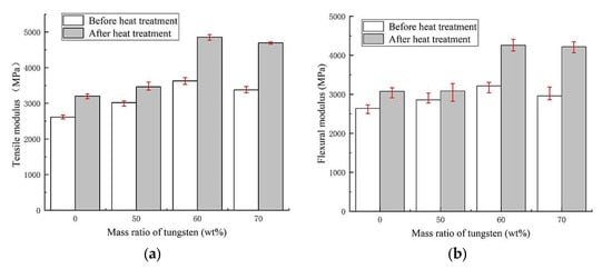 The tensile modulus and flexural modulus of PEEK and PEEK/tungsten composites are summarized in Figure 14. Before heat treatment, the tensile modulus of PEEK composites increased with tungsten content before reaching 60%. After that, the tensile modulus started to decrease, similar to the variation trend of the flexural modulus. After heat-treatment, both the tensile modulus and flexural modulus of PEEK and PEEK/tungsten composites greatly improved. The tensile moduli of PEEK and 50 wt.%, 60 wt.% and 70 wt.% PEEK/tungsten composites all rose by 22.58%, 14.76%, 33.82%, 38.95%, respectively. The flexural moduli also enhanced by 16.54%, 7.99%, 32.41% and 42.51%, respectively.