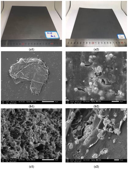 PEEK composite test pieces: (a1) 30 wt.% PEEK/boron carbide shielding body, (a2) 70 wt.% PEEK/tungsten shielding body, (b1) electron micrograph of 30 wt.% PEEK/boron carbide shielding body layer surface (×2500), (b2) electron micrograph of 70% PEEK/boron carbide shielding body layer surface (×1500), (c1) electron micrograph of broken section of 70 wt.% PEEK/tungsten shielding body (×500), and (c2) electron micrograph of broken section of 70 wt.% PEEK/tungsten shielding body (×1000).