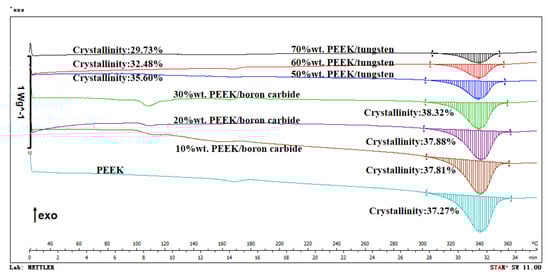 Meanwhile, such changes induced differences in crystallinity—a key parameter to characterize the properties of polymers. The respective differential scanning calorimeter (DSC) curves of the PEEK, PEEK/boron carbide, and PEEK/tungsten composites are illustrated in Figure 18. Since the melting of PEEK may induce an endothermic peak, the shaded area in Figure 18 may refer to the crystalline region of PEEK in the composites. The larger crystal area suggested a greater crystallinity and better heat resistance of the materials. The respective crystallinities of PEEK, 10 wt.%, 20 wt.%, and 30 wt.% PEEK/boron carbide composites were recorded as 37.27%, 37.81%, 37.88%, and 38.32%. However, the crystallinity of 50 wt.%, 60 wt.%, and 70 wt.% of the PEEK/tungsten composites appeared significantly lower than those of PEEK and PEEK/boron carbide composites. Compared to PEEK, the crystallinity of 50 wt.%, 60 wt.%, and 70 wt.% of the PEEK/tungsten composites decreased by 4.48%, 12.85%, and 20.23%, respectively. Therefore, the heat deflection temperature of PEEK/tungsten composites diminished as tungsten content increased.