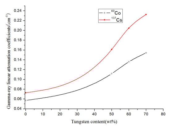In the experiment, test pieces were heat treated, and attenuation characteristics of the new PEEK/tungsten shielding materials are listed in Table 5. The values may further explain the linear attenuation coefficient and half-absorption thickness. Note that sample #0 represented pure PEEK material, and #1, #2 and #3 refer to, respectively, 50 wt.%, 60 wt.% and 70 wt.% PEEK/tungsten composite materials. Note that two sources of energy (137Cs and 60Co) were used in the experiments.