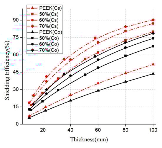 The FDM 3D printed shielding test pieces displayed good shielding effects at 137CS and 60Co sources (Figure 19). Higher tungsten contents led to a better shielding effect. As for test pieces containing the same tungsten content, the linear attenuation absorption coefficient obtained at 137Cs was superior to that at 60Co, indicating a better shielding effect of the new materials against low-energy gamma-rays (137Cs) when compared to high-energy gamma-rays (60Co). The shielding properties of PEEK composites with different thicknesses and tungsten contents are compiled in Figure 20. The black and red curves represent the gamma-ray shielding effects under 60Co and 137Cs sources, respectively.