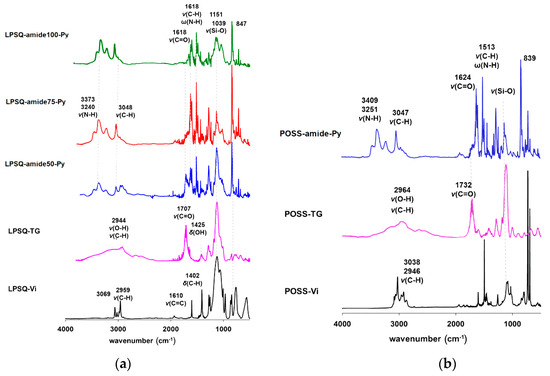 The reaction progress was monitored by FTIR and it was carried out until the planned conversion of carboxylic groups into amides occurred. The assignment of IR characteristic bands is presented in Figure 2 and Table S3. Amide bond formation was confirmed by disappearance of the vibration band typical for ν(C=O) in carboxylic acids (1750–1700 cm−1) and formation of new bands characteristic of amides: ν(C(O)N) (1700–1600 cm−1) and ν(C-N) in combination with δ(N-H) (1600–1500 cm−1). The amount of amide groups in side chains influenced the position of vibrational bands. Increasing the ratio of amide groups led to the shift of ν(C(O)N) mode toward lower wavenumbers (from 1640 cm−1 for LPSQ-amide50-Py to 1618 cm−1 for LPSQ-amide100-Py). A similar position of the ν(C(O)N) band was found for POSS-amide-Py (1624 cm−1). All the obtained materials were characterized with 1H, 13C and 29Si NMR spectroscopy (in solution and in solid state) (Supplementary Information).