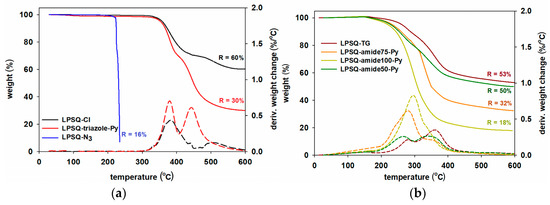 Thermogravimetric analysis of (a) LPSQ-triazole-Py and (b) LPSQ-amides-Py (N2 atmosphere, 10 °C/min).