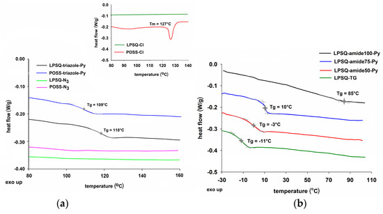 Thermal analysis of (a) LPSQ and POSS-triazole-Py (inset: LPSQ-Cl and POSS-Cl) (b) LPSQ-amide-Py. DSC traces recorded at a heating rate of 10 °C/min (3rd run).