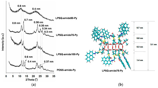 (a) WAXS diffractograms of thin films of LPSQ-amide-Py and POSS-amide-Py cast on silicon plates from DMF solutions; (b) HyperChem [37] calculated structure for LPSQ-amide75-Py.