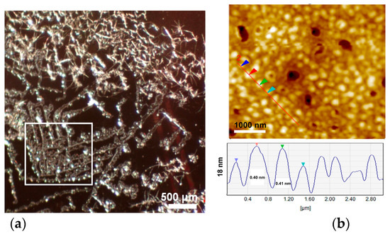 (a) Reflected light micrographs and (b) atomic force microscopy image and cross-section of LPSQ-amide75-Py crystals. AFM image shows the top of a typical crystal surface in the area marked with the white frame.