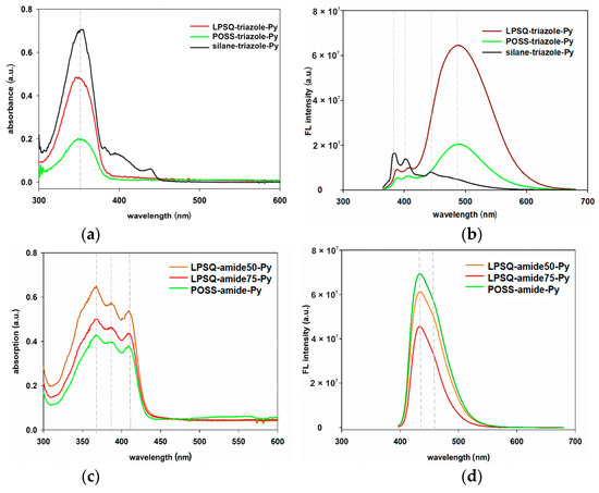 Comparison of (a) absorption and (b) FL emission spectra (λex = 350 nm) of LPSQ, POSS, silane-triazole (cPy = 10−6 mol/L in THF), (c) absorption and (d) FL emission spectra (λex = 387 nm) of LPSQ-amide50-Py, LPSQ-amide75-Py and POSS-amide-Py (cPy = 10−6 mol/L in DMF).