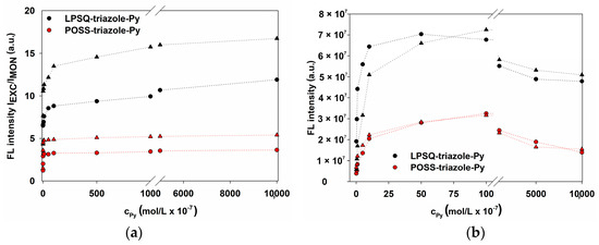 FL emission intensity of LPSQ derivative is more than twice as high as that of POSS (Figure 10b and Figure S10). FL quenching occurred at a similar concentration for both silsesquioxanes (at cPy ≥ 5 × 10−5 mol/L). No solvent effect was observed concerning the intensity and shape of FL emission bands of LPSQ and POSS-triazole-Py.