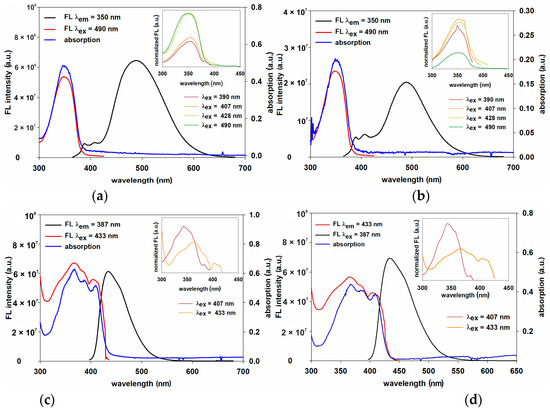 The excitation spectra of LPSQ and POSS-amide-Py in DMF were recorded at the wavelength λem = 433 nm that responded to the maximum of FL emission intensity (Figure 11c,d and Figure S11). Excitation spectra were also recorded in DMF at the emission wavelength of 407 nm. The observed degree of correlation with the respective absorption spectra was very similar. They do not overlap which suggests that observed excimers for LPSQ and POSS-amide-Py are static in nature and their formation is not dependent on the diffusion or the solution concentration [68].