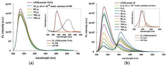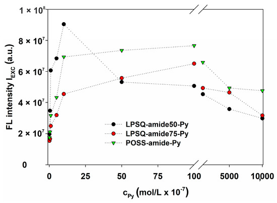 FL spectra of dilute solutions of LPSQ and POSS-amide-Py in DMF exhibited exclusively a bright emission band with a maximum at 433 nm (Figure 9d and Figure S9). High intensity of this emission band, even in the most diluted solutions, suggests the intramolecular nature of excimers due to the congestion of chromophores along the polymer chain. The shape of FL emission bands of all materials bearing amide groups in their side chains is very similar. Spectra with a maximum of FL emission intensity at ~430 nm was previously reported for various pyrene-1-carboxamides [66,67]. The decrease in fluorescence intensity with the increase in concentration in solution occurred more rapidly for LPSQ-amide50-Py (cPy ≥ 10−6 mol/L) than for LPSQ-amide75-Py and POSS-amide-Py (cPy ≥ 5 × 10−5 mol/L) (Figure 12). this can be explained by a more pronounced influence of intermolecular interactions for LPSQ-amide50-Py.