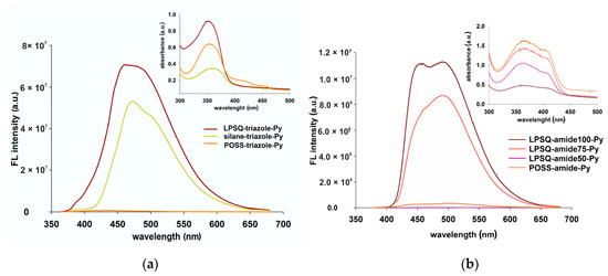 Despite the structural differences, both LPSQ and POSS-triazole-Py are emissive in the solid state (Figure 13a). The much stronger intensity of LPSQ-triazole-Py FL emission than that of the POSS counterpart can be ascribed to the stronger interactions between pyrene moieties along the linear chains than around 3D inorganic cores of the polyhedral compound. The λmax in the FL spectrum of LPSQ-triazole-Py is blue shifted in comparison to POSS-triazole-Py which illustrates the difference in supramolecular organization of Py moieties in the solid state for both materials. Differences in the FL emission λmax were previously observed for LPSQ-Py and POSS-Py [30]. For the studied silsesquioxane derivatives containing amide groups, LPSQ-amide100-Py and LPSQ-amide75-Py exhibited the highest FL emission intensity (Figure 13b). The observed differences in the FL emission intensity of LPSQ-amide100-Py and POSS-amide-Py were similar to the FL emission intensity of LPSQ and POSS-triazole-Py. LPSQ-amide50-Py exhibited the lowest FL emission intensity (Figure 13b).