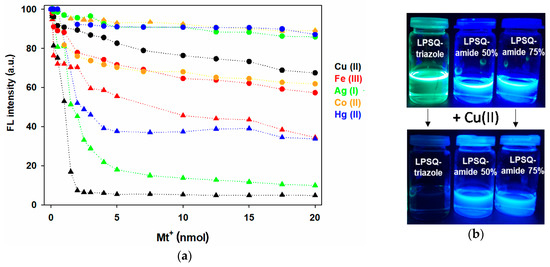 For measurements with metal cations (Zn (II), Ca (II), Pb (II), Hg (II), Cu (II), Co (II), Ag (I), Fe (III), Mg (II)), a chosen amount (1–200 μL) of appropriate perchlorate (V) salt (10−4 mol/L, in THF for triazole derivatives or in DMF for amide derivatives) was added to the solution (3 mL) of LPSQ/POSS-triazole-Py in THF or LPSQ/POSS-amide-Py in DMF at concentration 10−6 mol/L of Py groups.